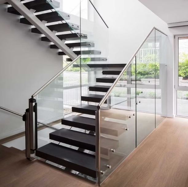 سلم زجاج كامل: الدرجات + الحواجز من الزجاج.
